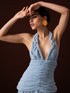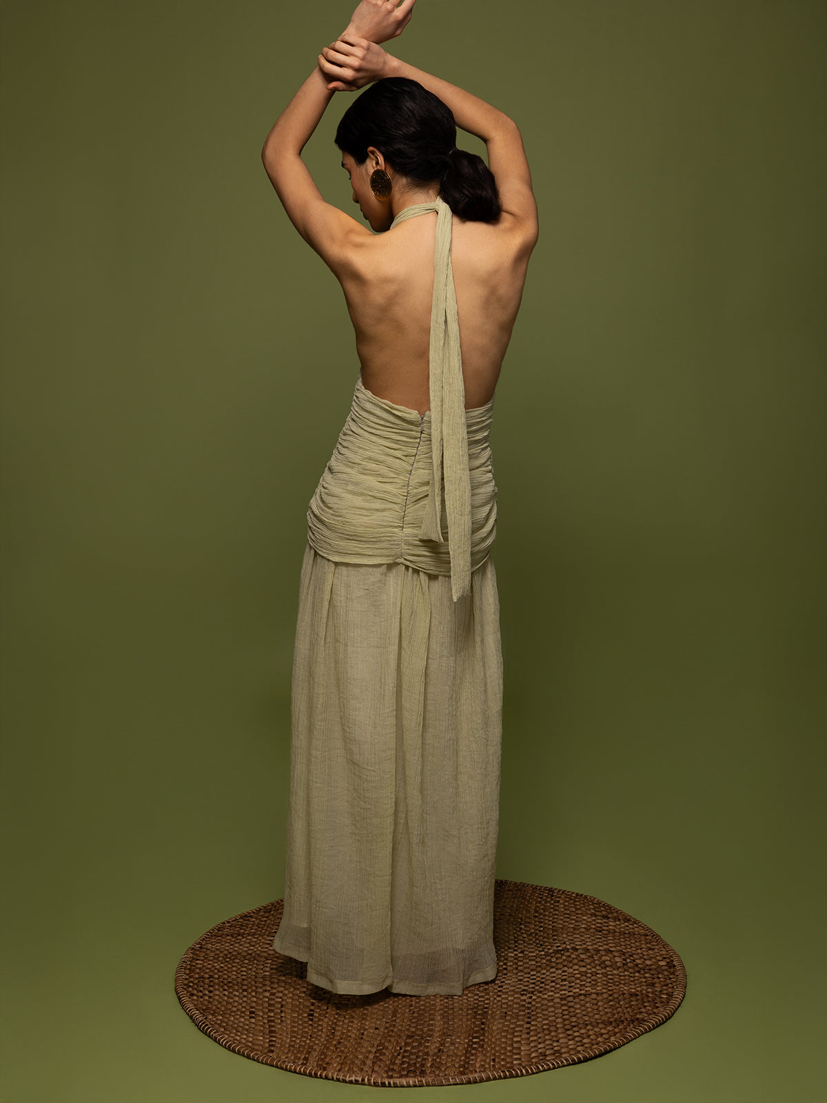 The Agua de Rio dress, un homenaje a la suavidad en estado puro. Confeccionado en una tela plisada, ligera como una pluma, que le da un aspecto suave y aireado. En el busto, un detalle trenzado a mano y de acabado crudo aporta textura y fuerza, en referencia a los nudos y la belleza utilitaria de la vida rural. La cintura se recoge suavemente con delicados frunces que marcan la forma, para luego dar paso a una falda larga y ligera.